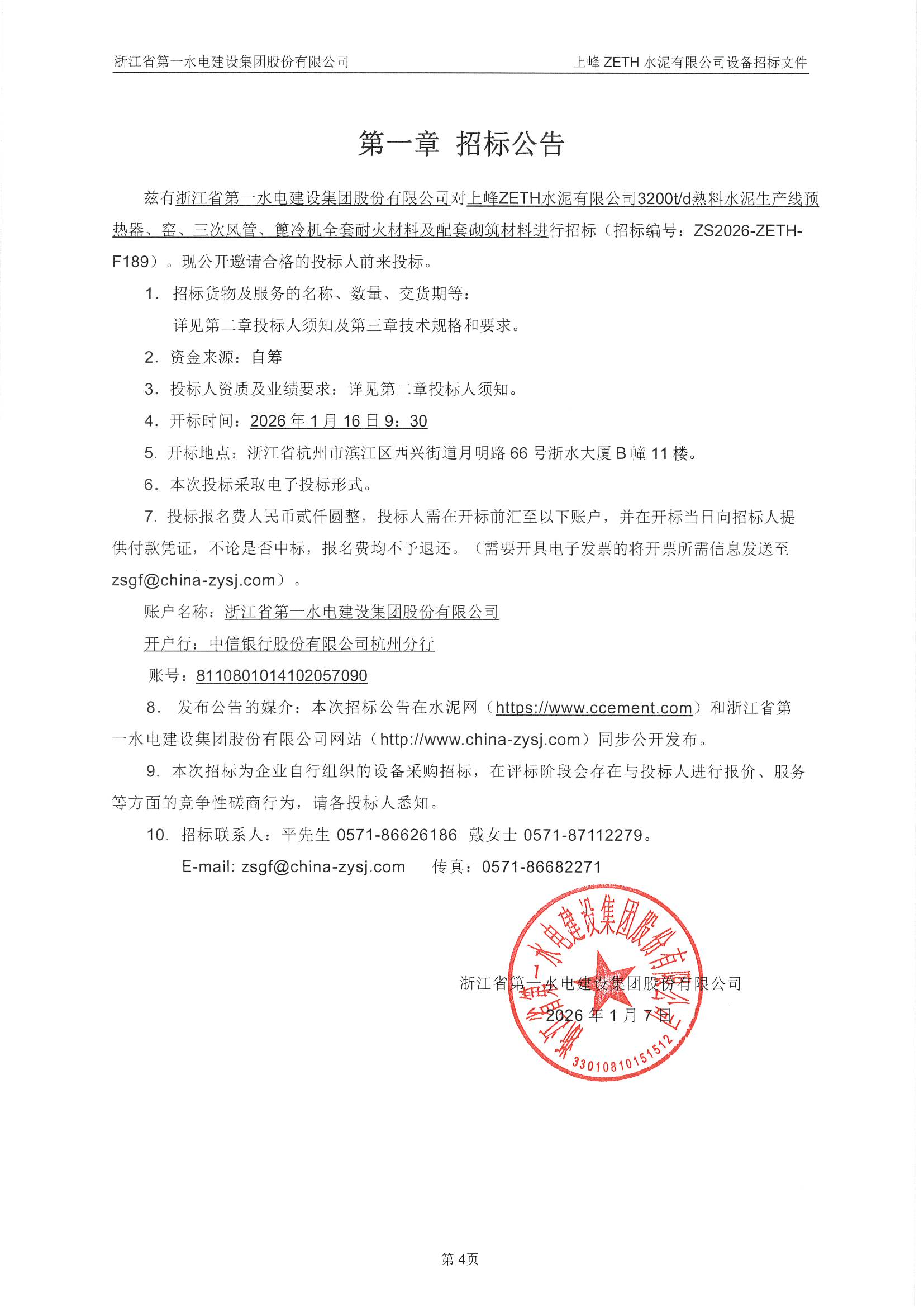 上峰ZETH水泥有限公司3200t/d熟料水泥生产线窑胴体扫描、窑高温、篦冷机高温看火装置招标公告
