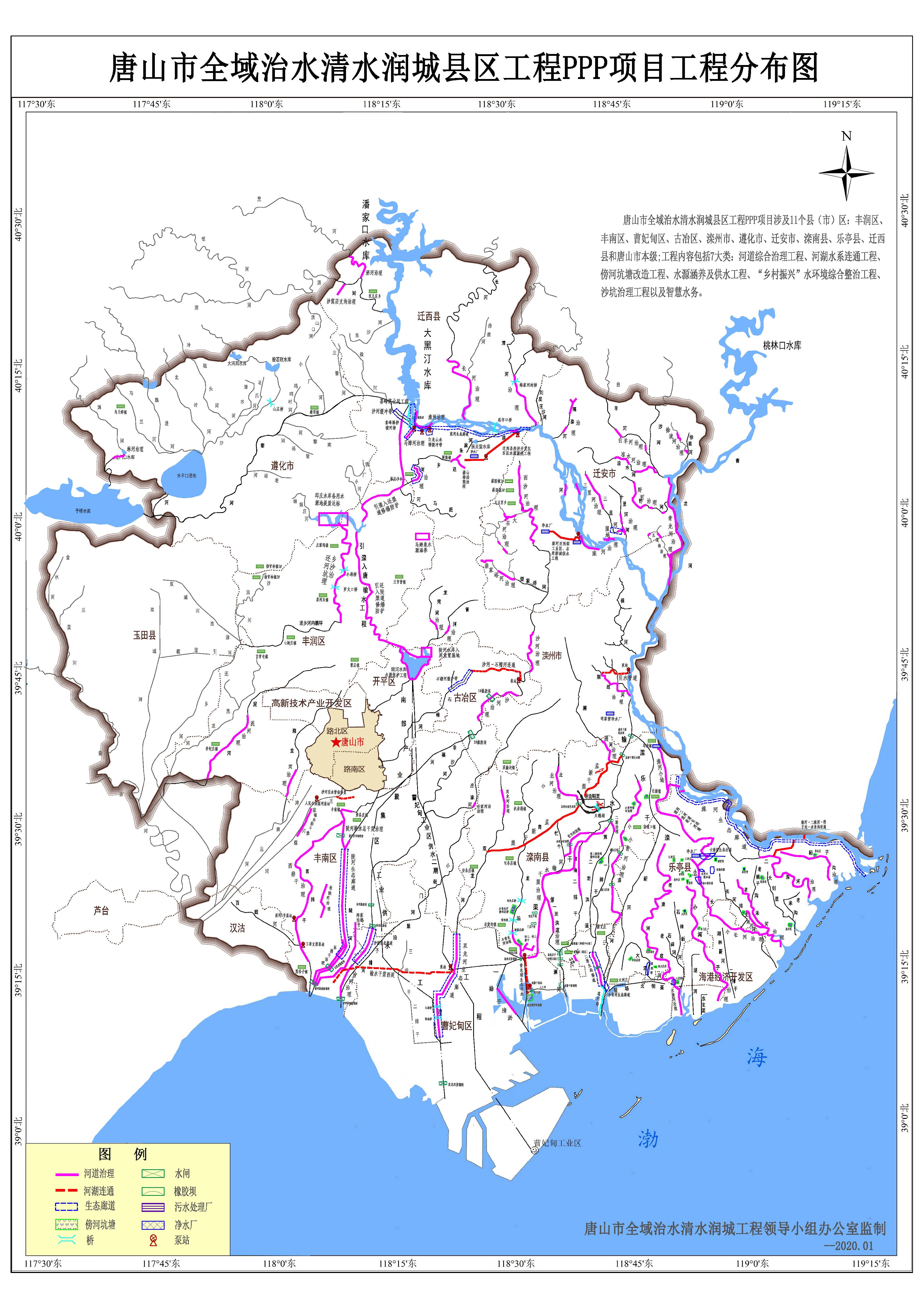 唐山市全域治水清水润城工程是全国首个“市带县PPP项目”,工程涉及滦河、冀东沿海和蓟运河三大水系,包括滦河、蓟运河、沙河、还乡河、陡河等5条主要河道。本工程项目为新建项目,包含河道综合治理工程、河湖水系连通工程、傍河坑塘改造工程、水源涵养及供水工程、“乡村振兴”水环境综合整治工程、沙坑治理工程以及智慧水务建设等共7大类、91个工程项目。